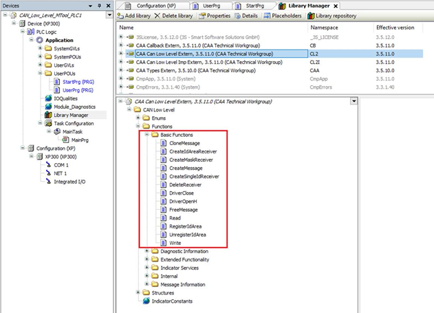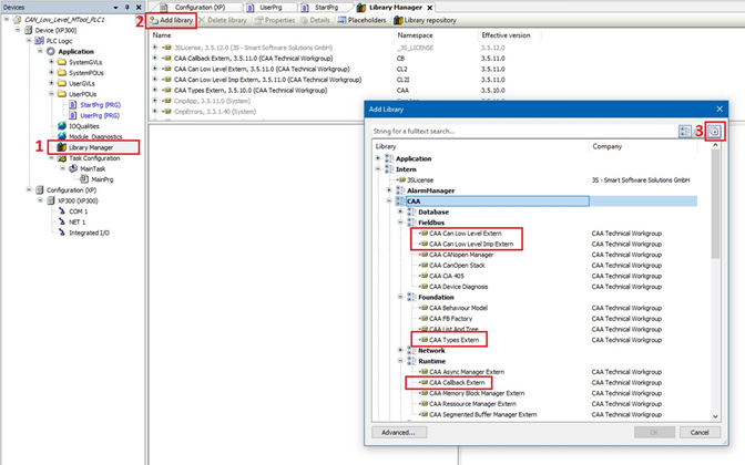 Low-level CAN communication is implemented by a group of CAA libraries (the same ones used by higher-layer protocols such as CANopen, J1939, etc.), which must be included in the application as described below: