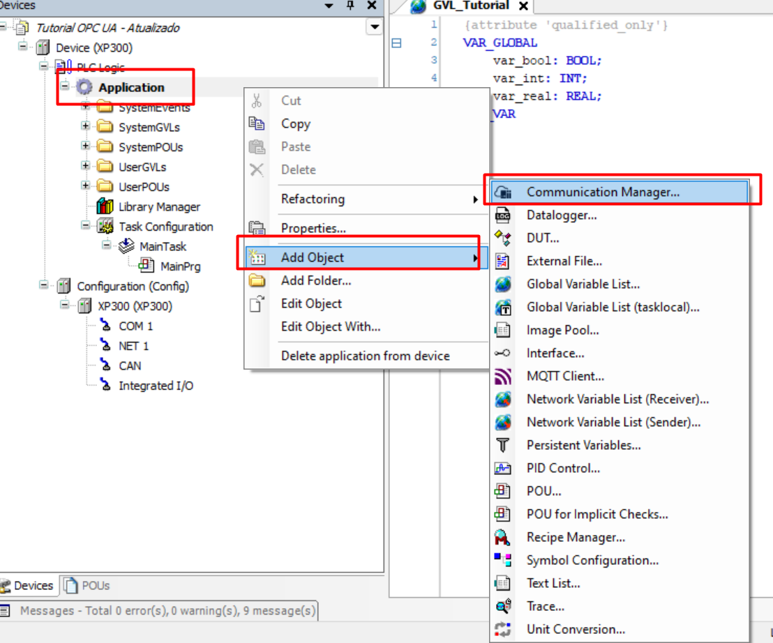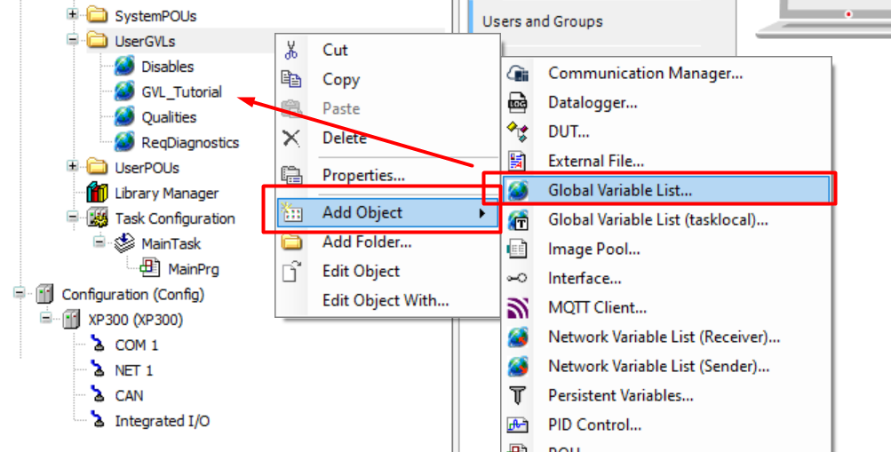 In this tutorial, we will create a project with the XP300 PLC, and we will create a GVL called GVL_Tutorial, where the variables to be communicated will be stored.