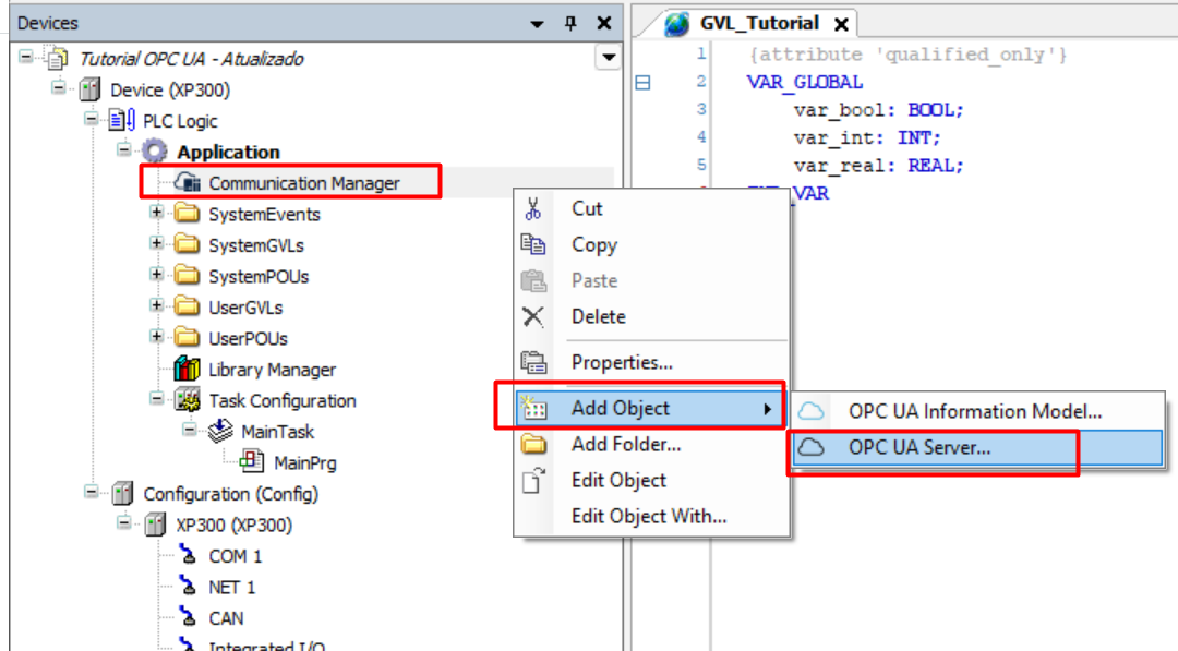 After declaring the communication variables, we can create the OPC communication driver: the Communication Manager.