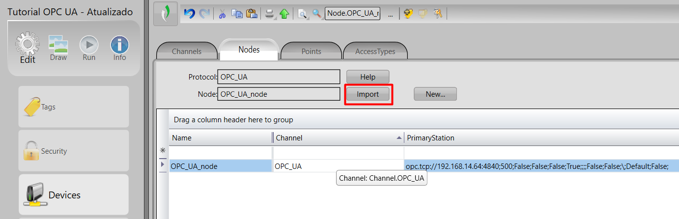 After creating the node, configuring it correctly, and obtaining success in the test, select the created node and click Import to get the variables.