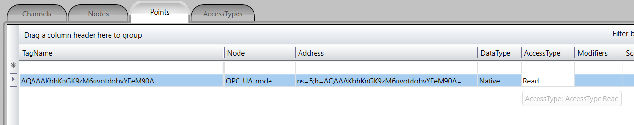 After importing, you can find a point created in the points tab with the declared variables. The type is set to Read, and we will change it to ReadWrite for demonstration.