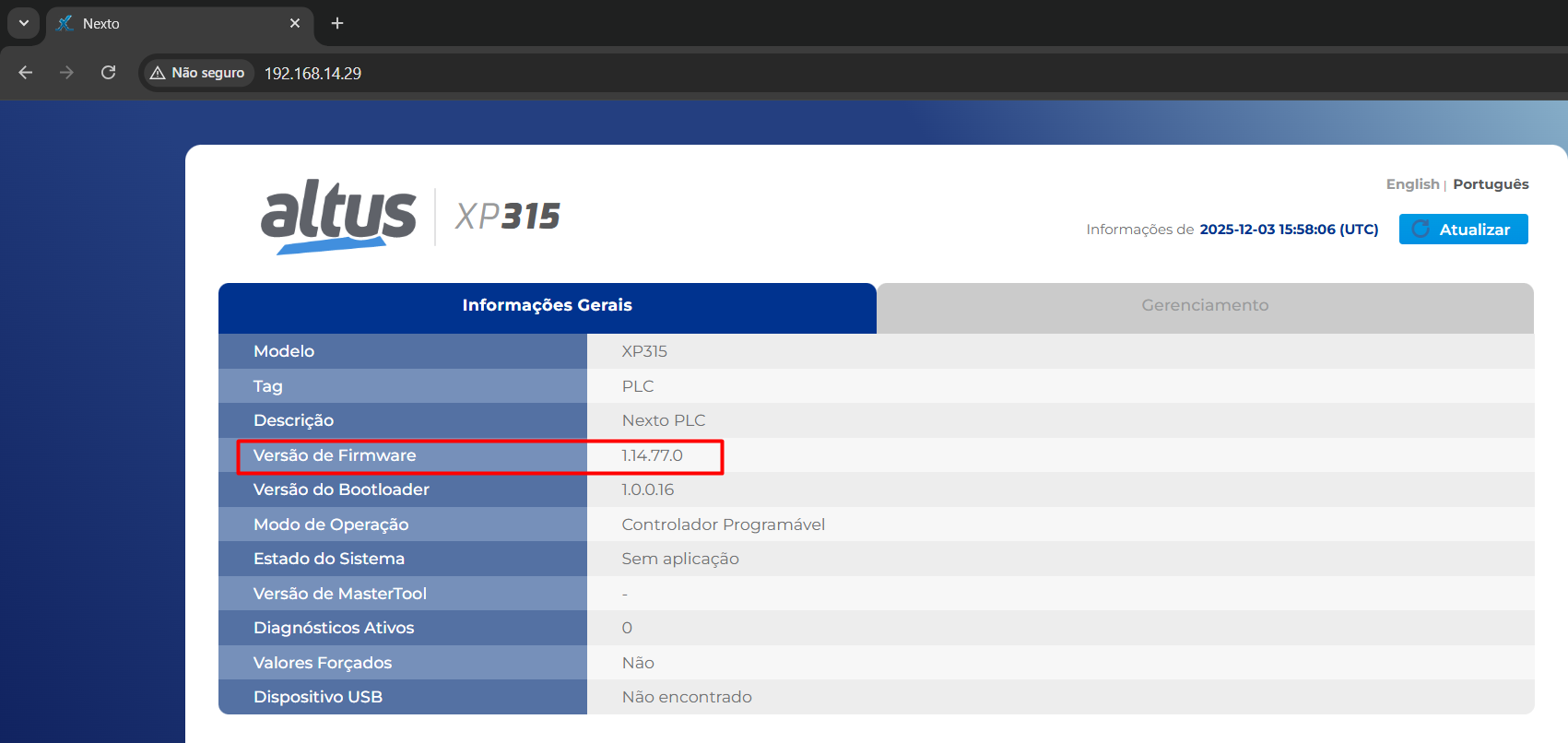 First, let's access the PLC's Web page and make sure our XP is running firmware 1.14.77.0 or higher.