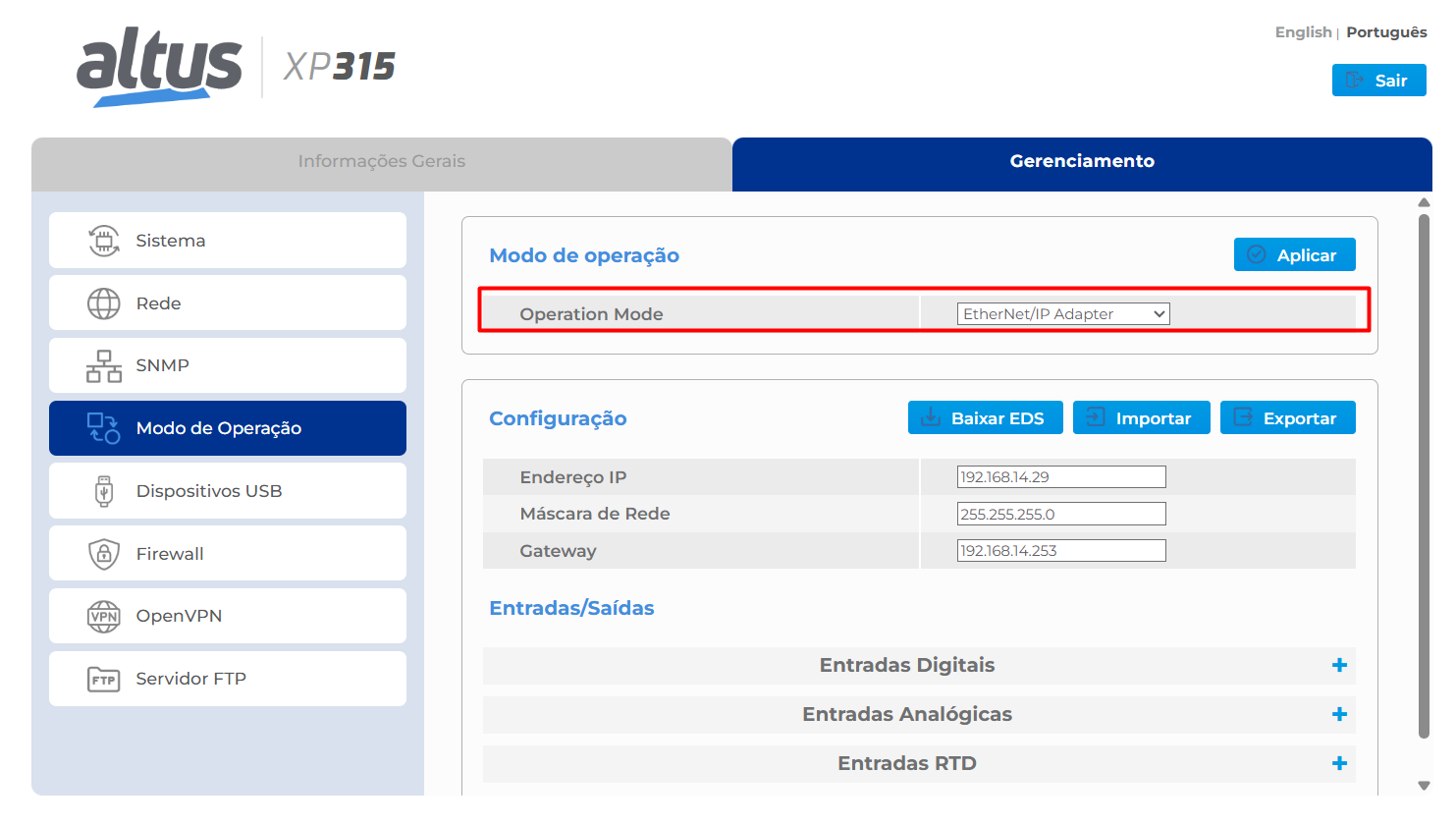 On this page, you can configure the PLC's inputs. After making the desired configurations, click on Download EDS and then on Apply. Enter the username and password admin again. The PLC will then restart with the new settings applied.