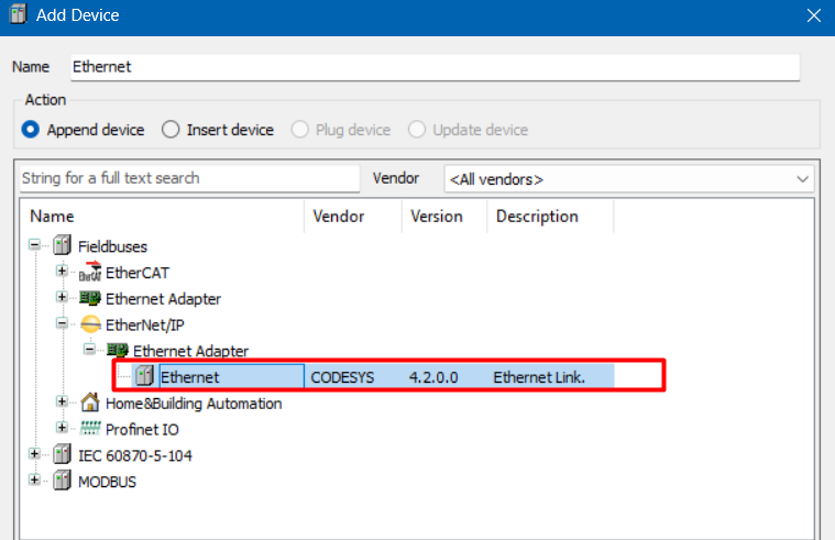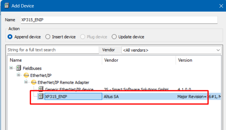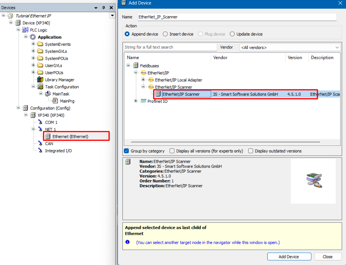 Then, click on the added Ethernet device and select the EtherNet/IP Scanner option.