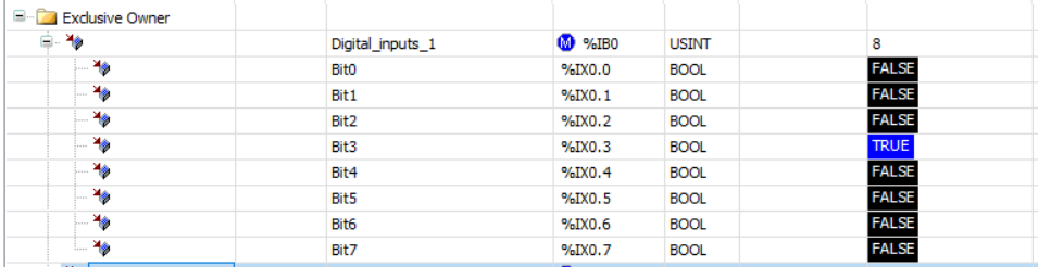 For demonstration purposes, input I03 of the remote (PLC configured as Adapter) was activated, and we received the value in Digital_Inputs on the Scanner PLC.