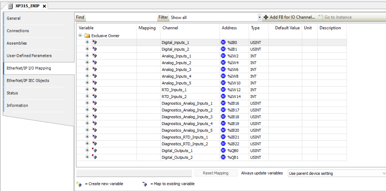 In EtherNet/IP I/O Mapping, you can view the complete mapping of the inputs and outputs of the added remote.
