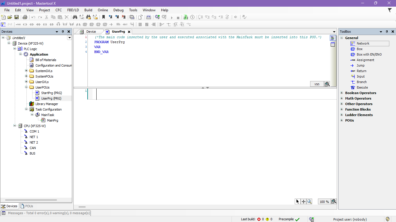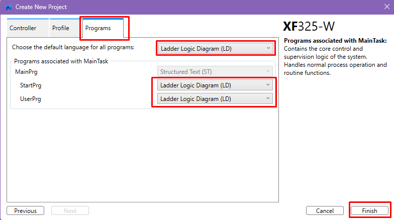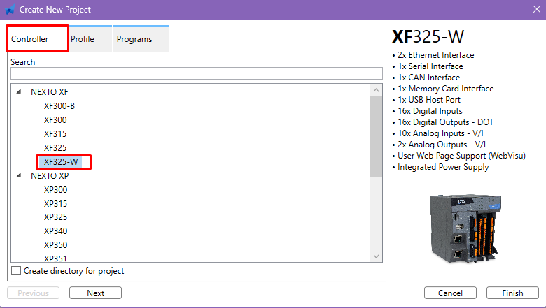 Then you need to select the device model for the Project. This is done in the Controller tab; when selecting the device model, its characteristics will appear on the right side of the window.
