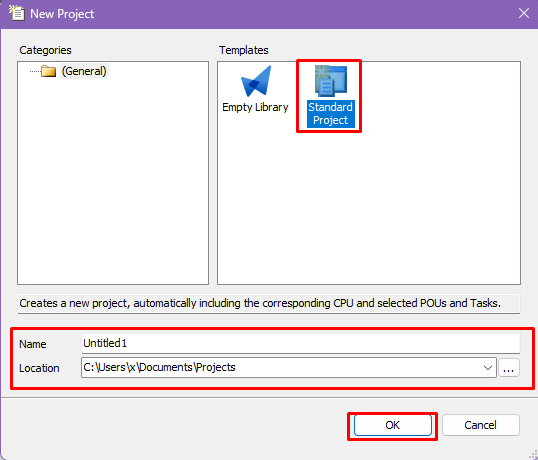 Next, you need to choose the Standard Project mode, enter a project name, and select a directory where the project will be saved. After that, click OK.
