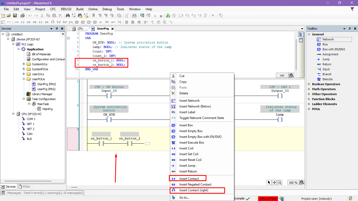 Access the Ladder Elements tab and select and drag it to the Contact code line. - Keyboard shortcut: