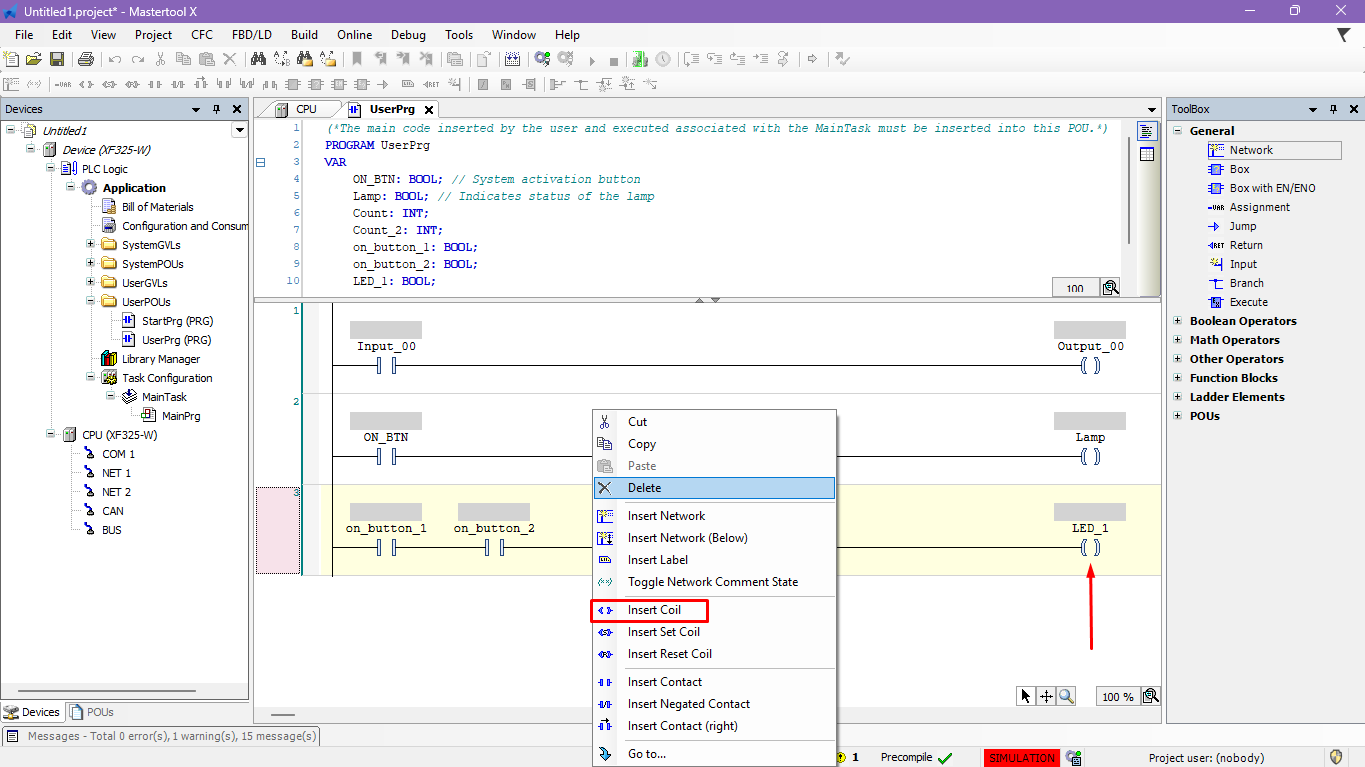 - At the end of the network, insert a coil and associate the output variable.