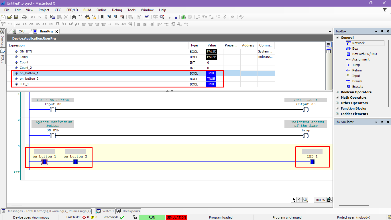 To do this, log in to the project and put the CPU in RUN mode. With the program running, the user can manipulate the variables associated with the contacts, either through Ladder logic or the variable table, changing their values to verify the operation of the AND logic.
