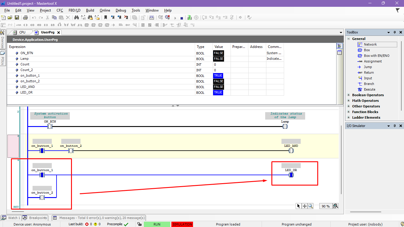 To do this, log in to the project and put the CPU in RUN mode. With the program running, the user can manipulate the variables associated with the contacts, either through Ladder logic or the variable table, changing their values to verify the operation of the OR logic.