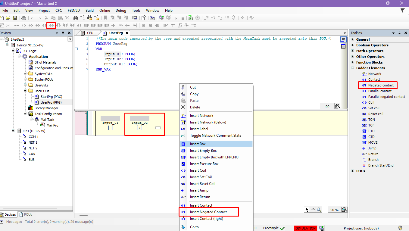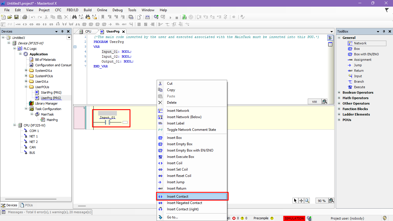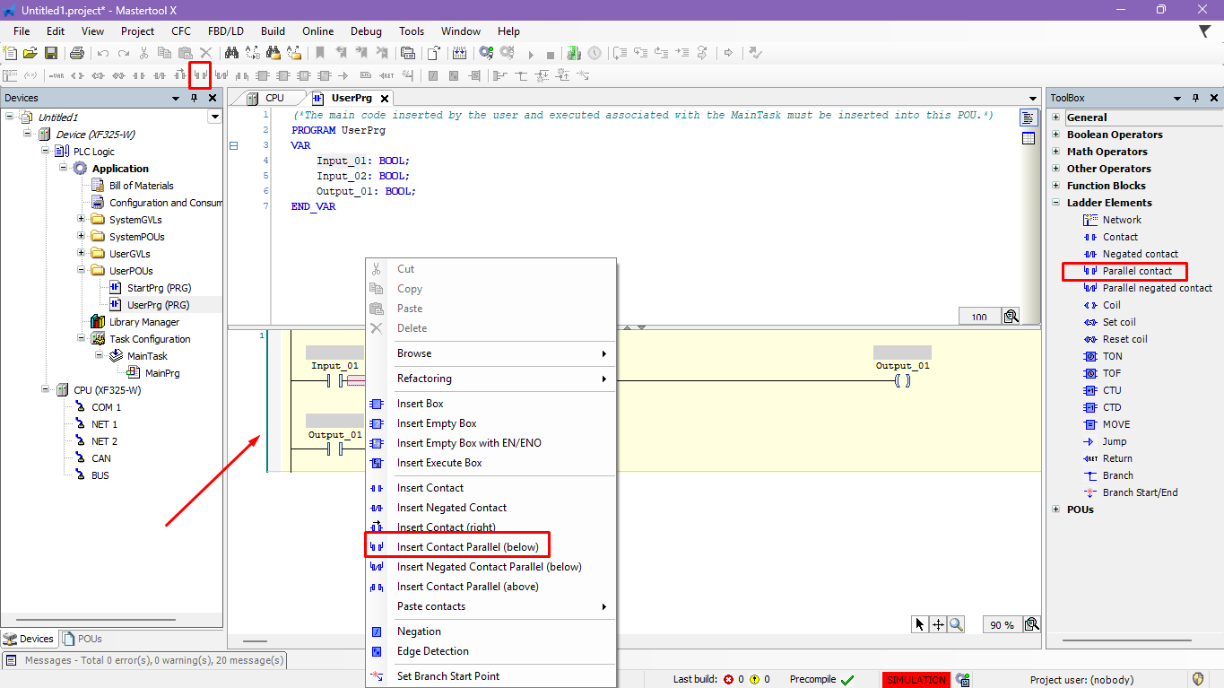 Access the Ladder Elements tab and select and drag it to the Contact code line. - Keyboard shortcut: