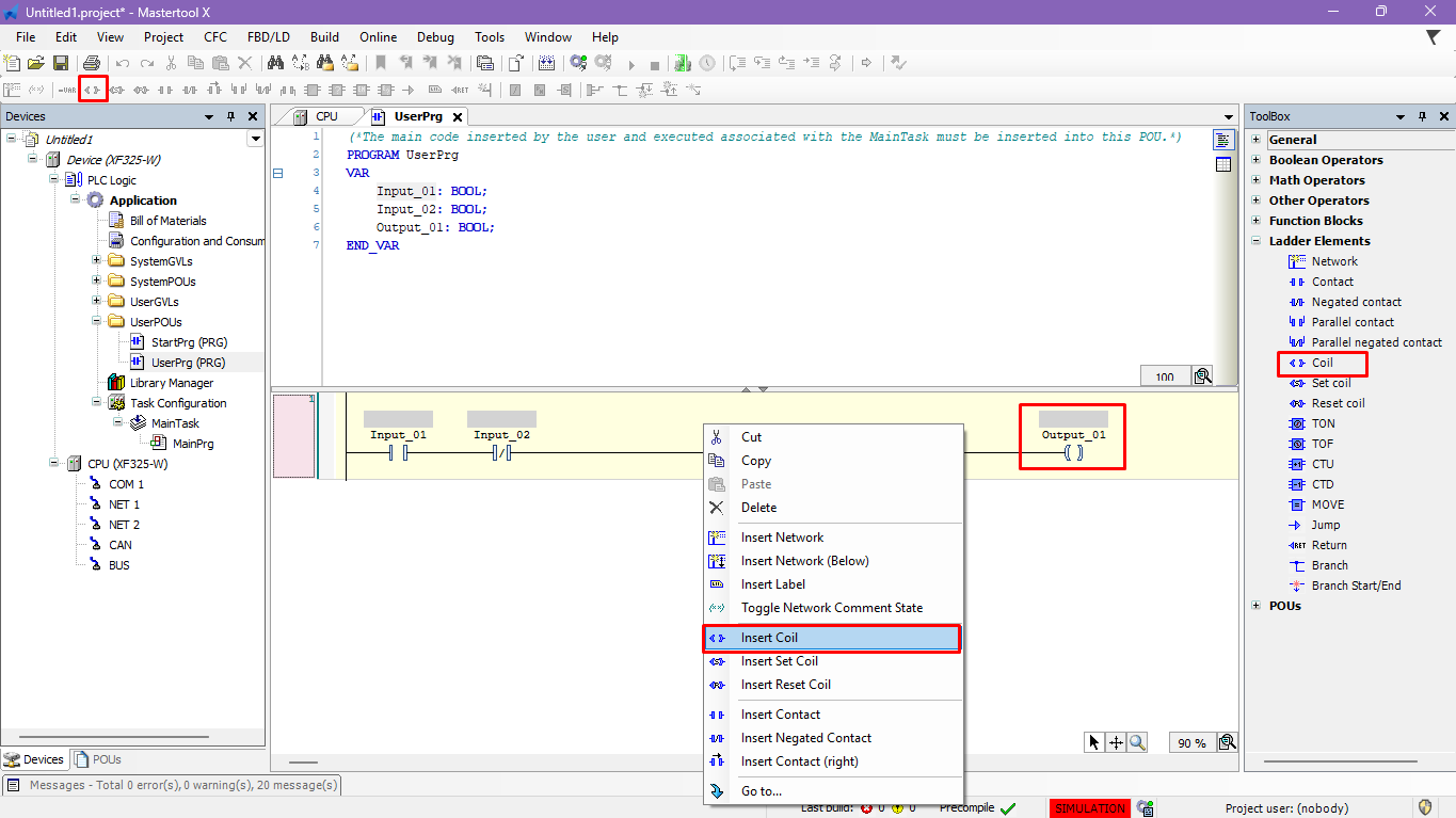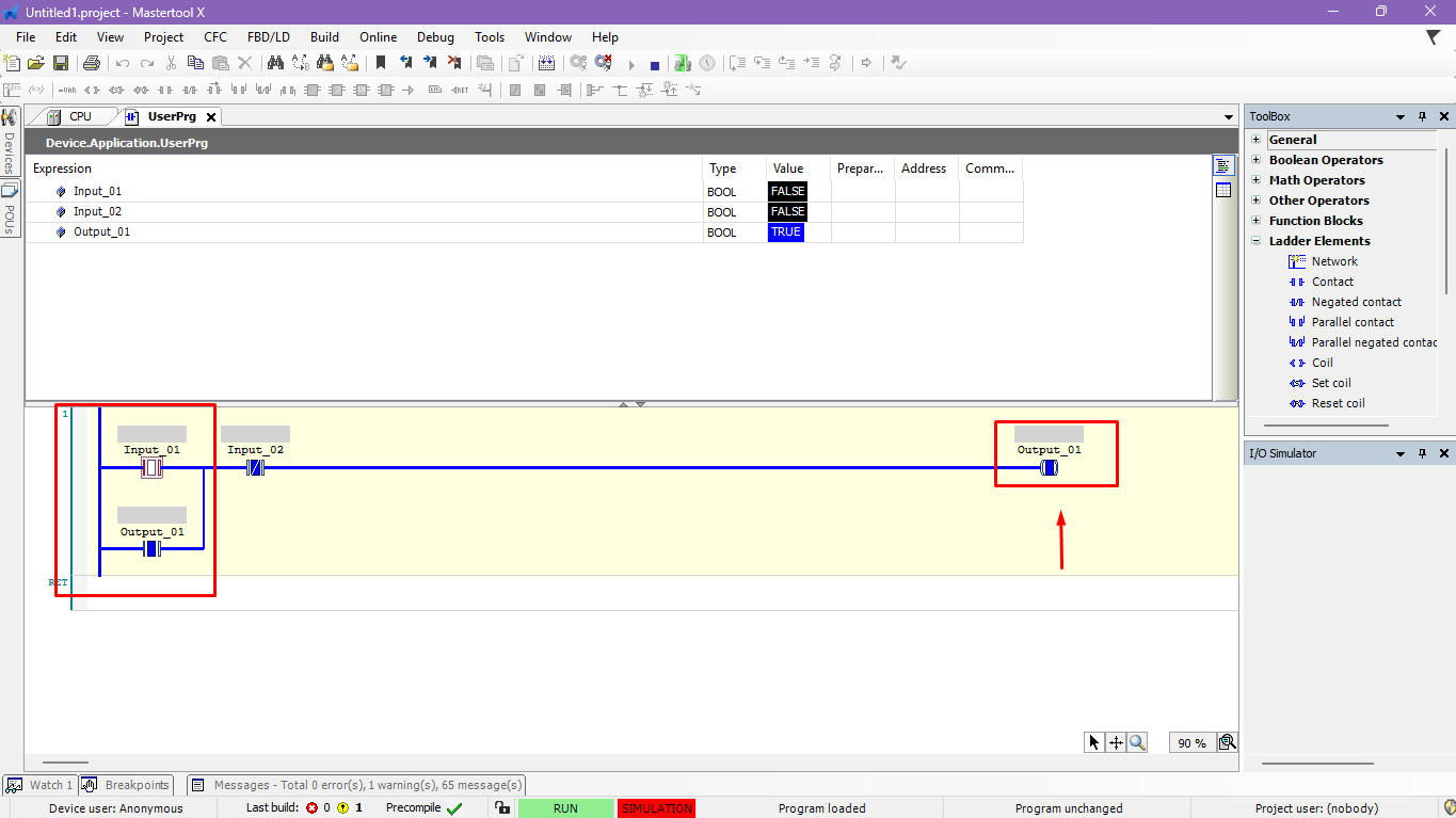 - Observe the behavior of the coil and the sealing contact in the Ladder logic.