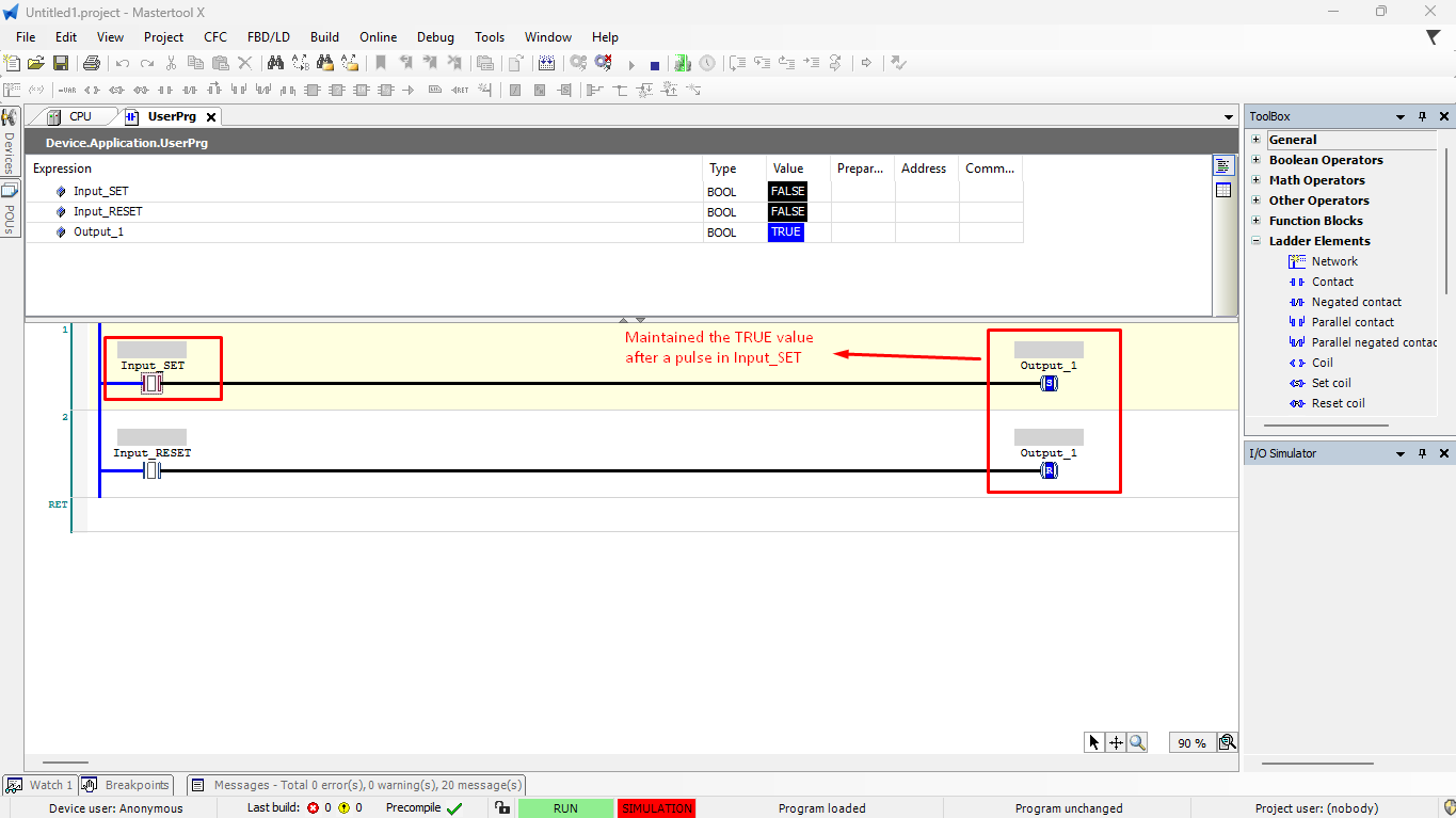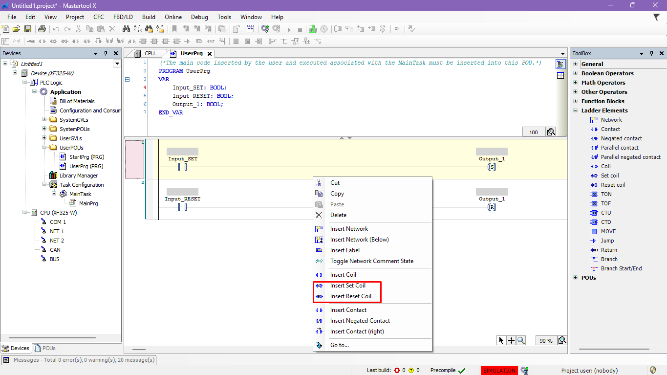 The objective of this tutorial is to create logic using Set and Reset coils in a MasterTool X project.