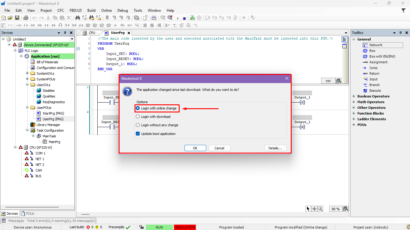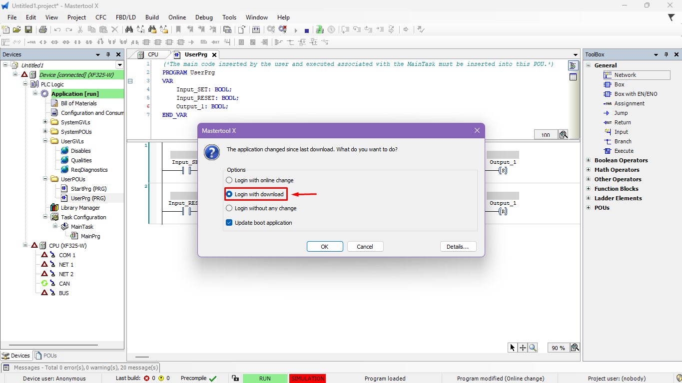 The objective of this tutorial is to explain the different ways to send new code to the PLC, assuming that there is already a working code in the controller in a MasterTool X project.