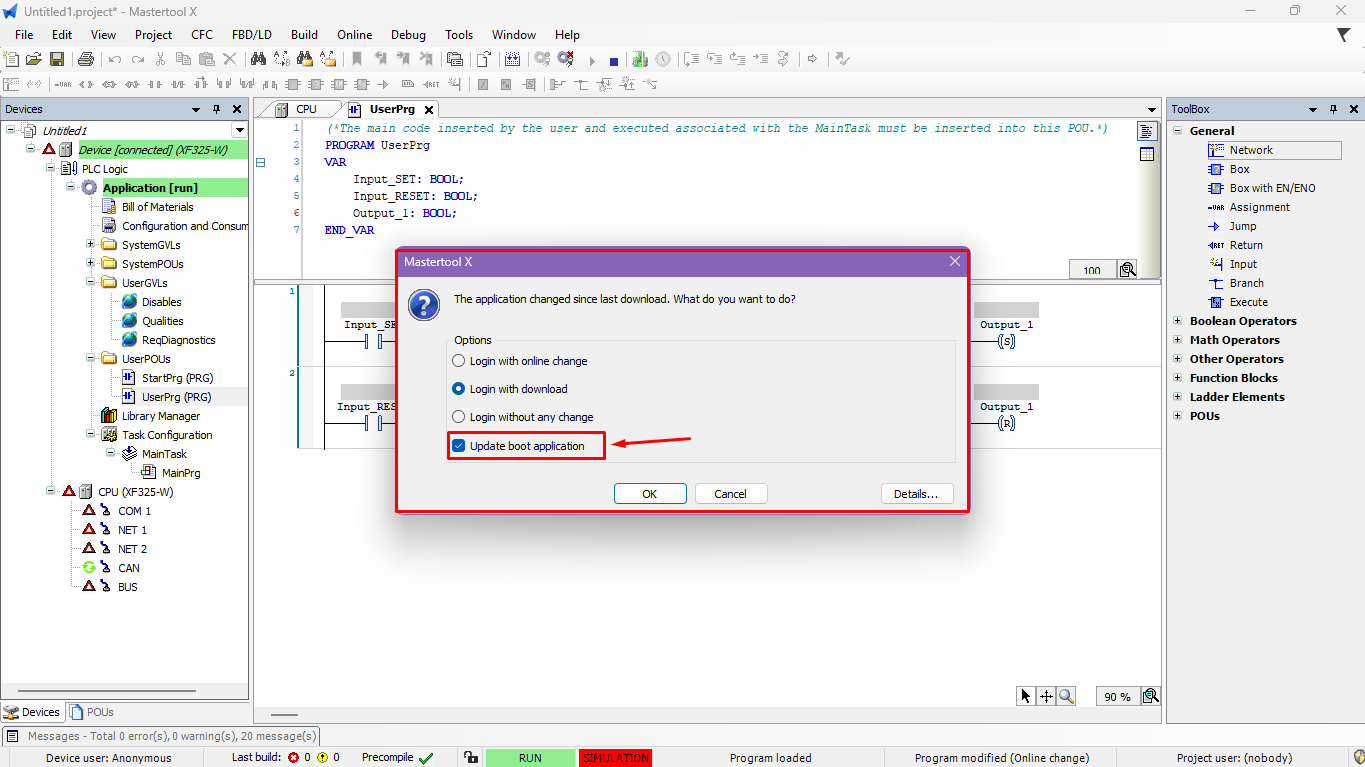- Update startup application: defines the code that will be loaded when the PLC is turned on