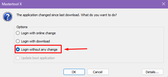 When the project undergoes changes since the last download and the user logs in, MasterTool displays a window asking how the application should be sent or synchronized with the PLC. Each option has a specific behavior in relation to the CPU state and the code being executed.