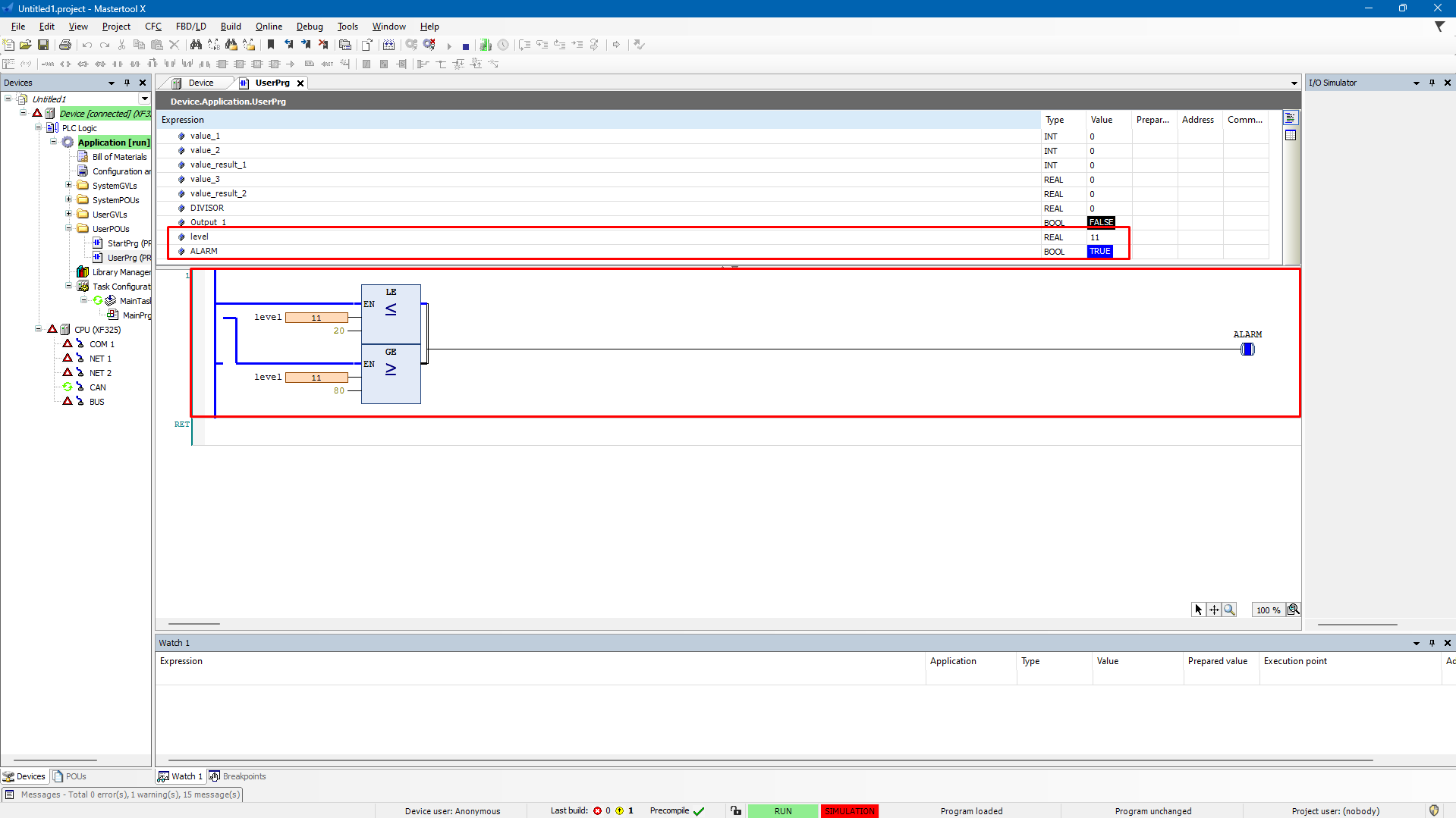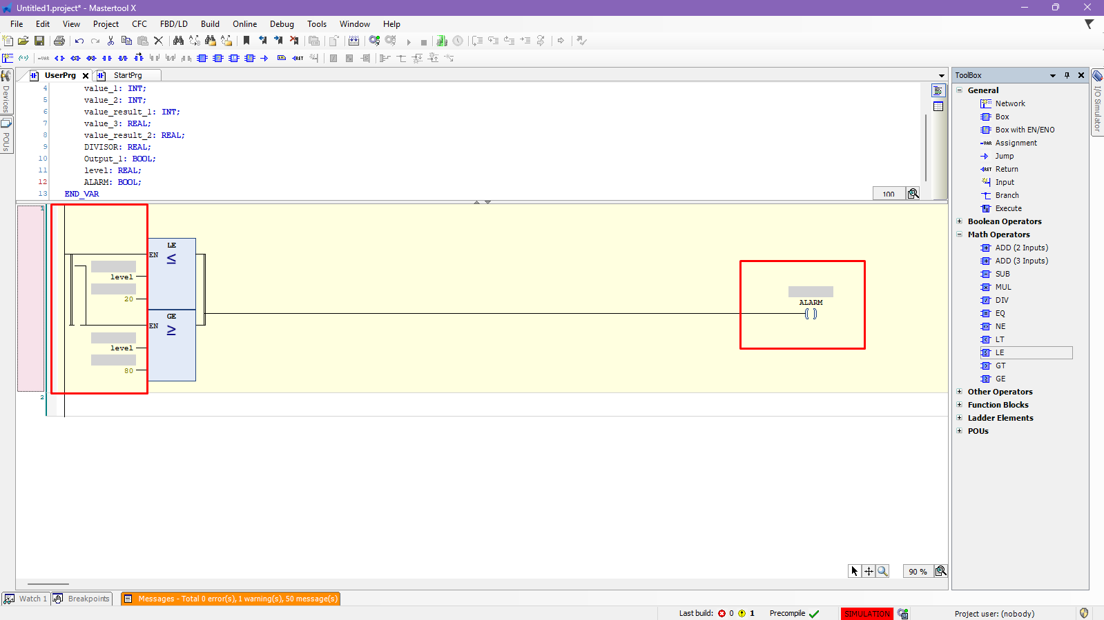 In this example, a logic will be built that activates a coil when the level is outside the normal range, i.e., below the lower limit (20) or above the upper limit (80).