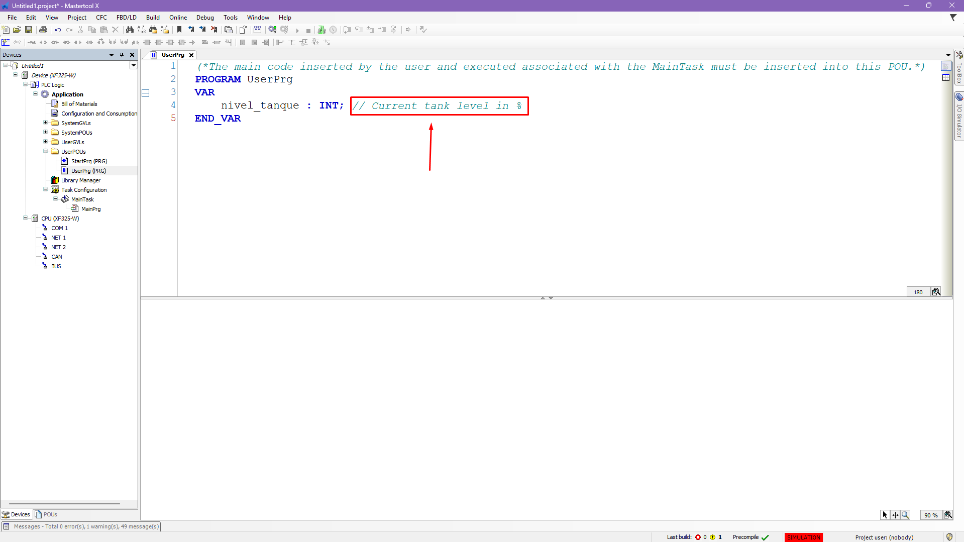 nivel_tanque : INT; // Current tank level in %The comment does not interfere with the program's execution and serves only as documentation.