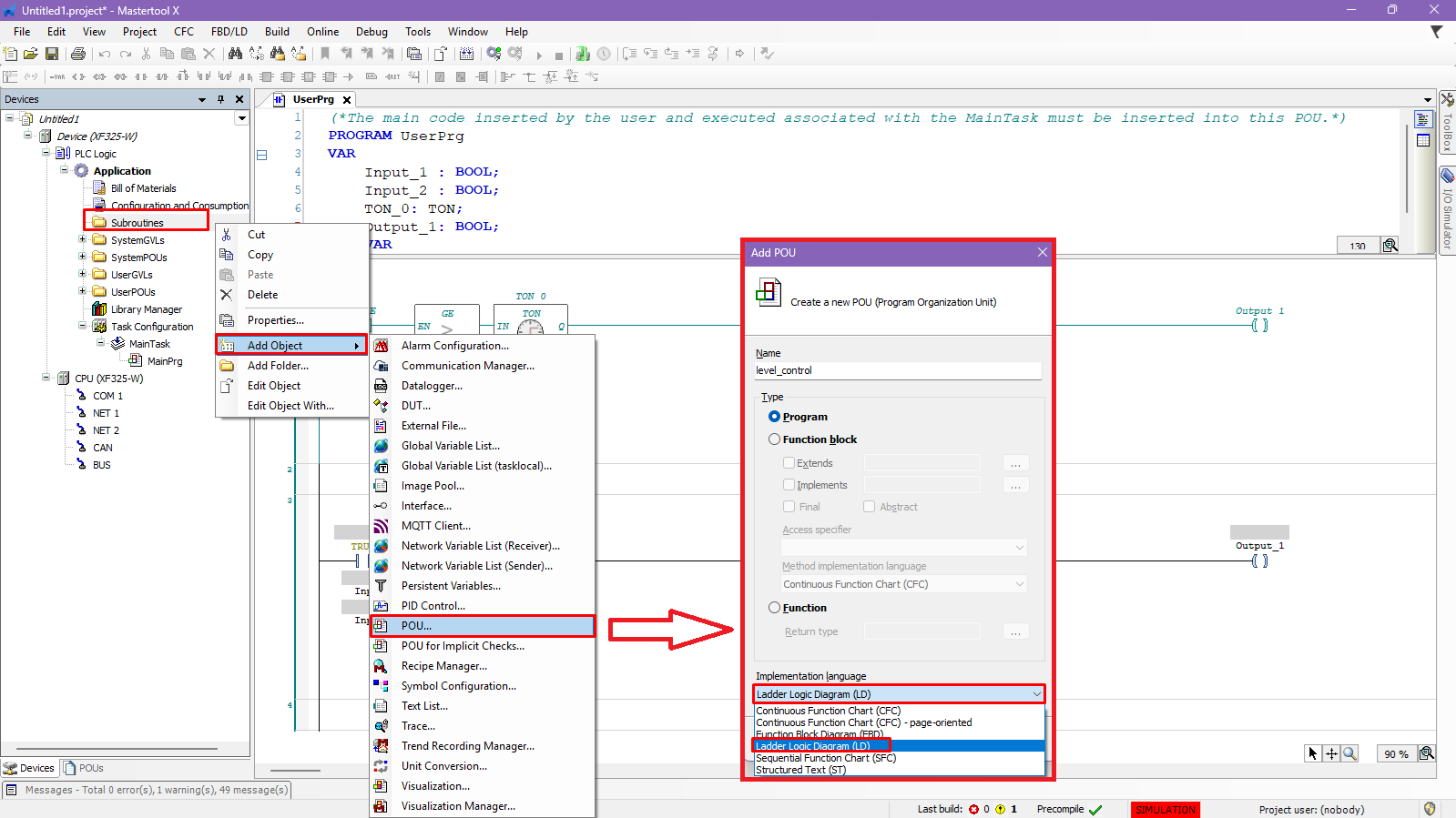 - Select the desired implementation language (e.g., LD – Ladder Diagram).