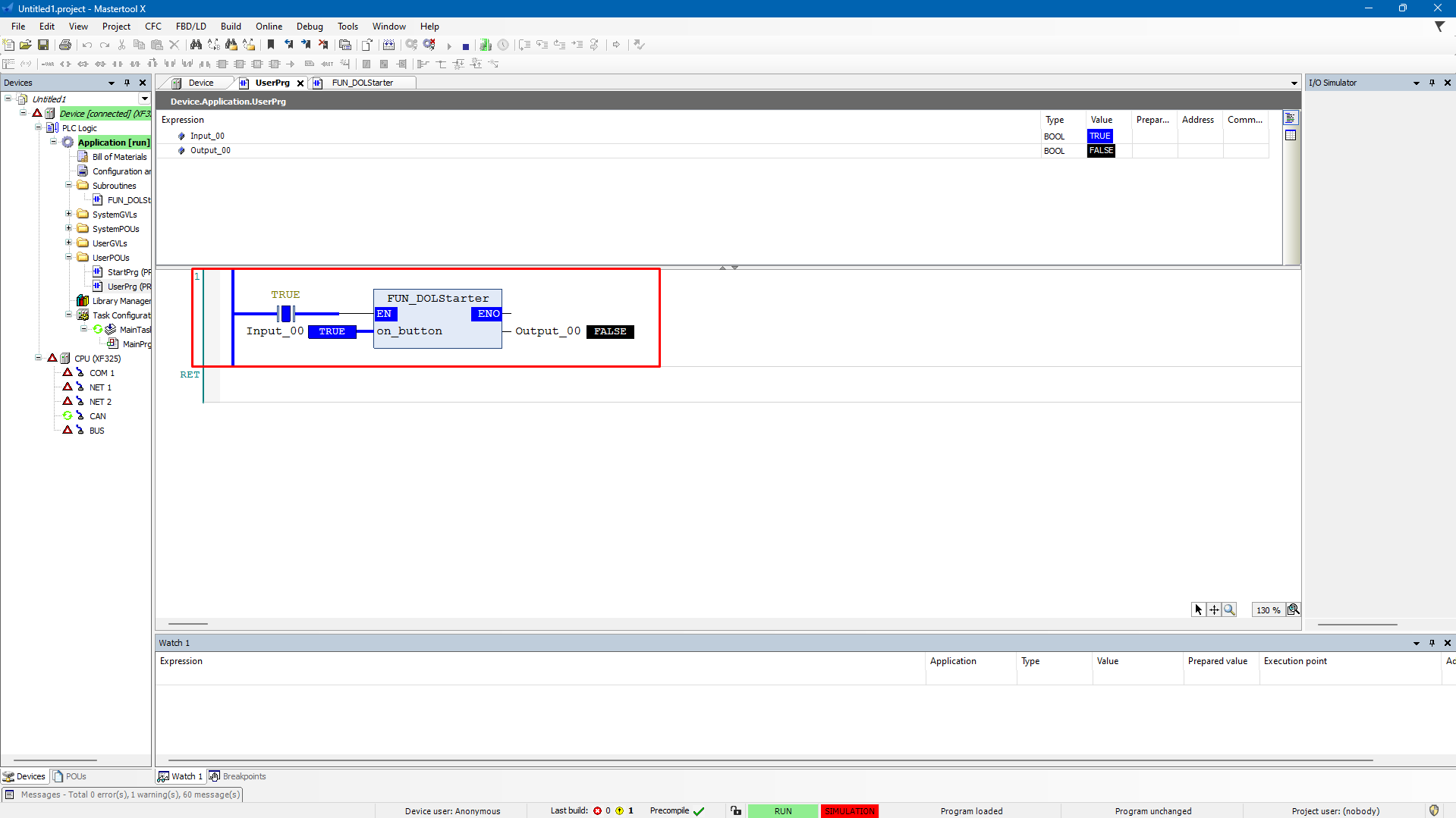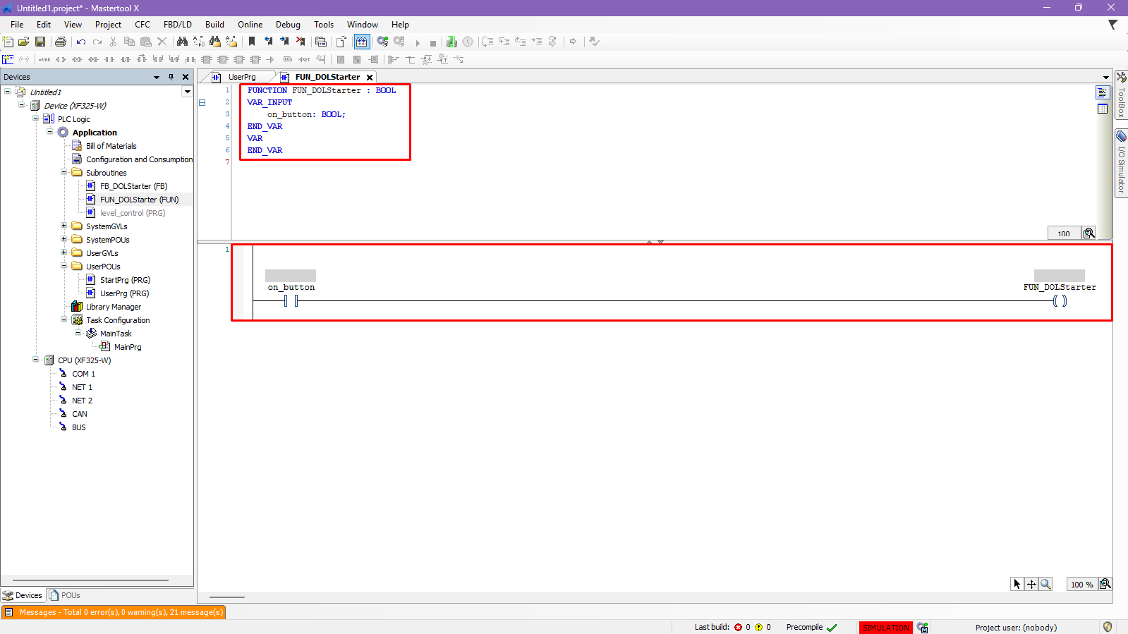 In this example, a function called fun_partida_direta will be created, with a BOOL return type, implemented in Ladder (LD).