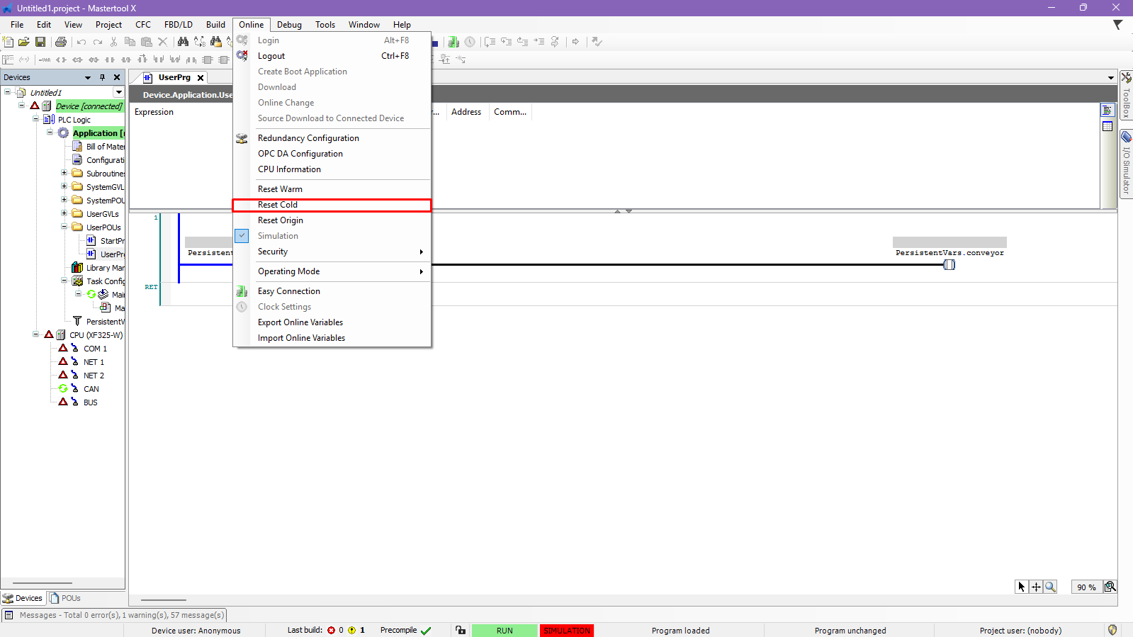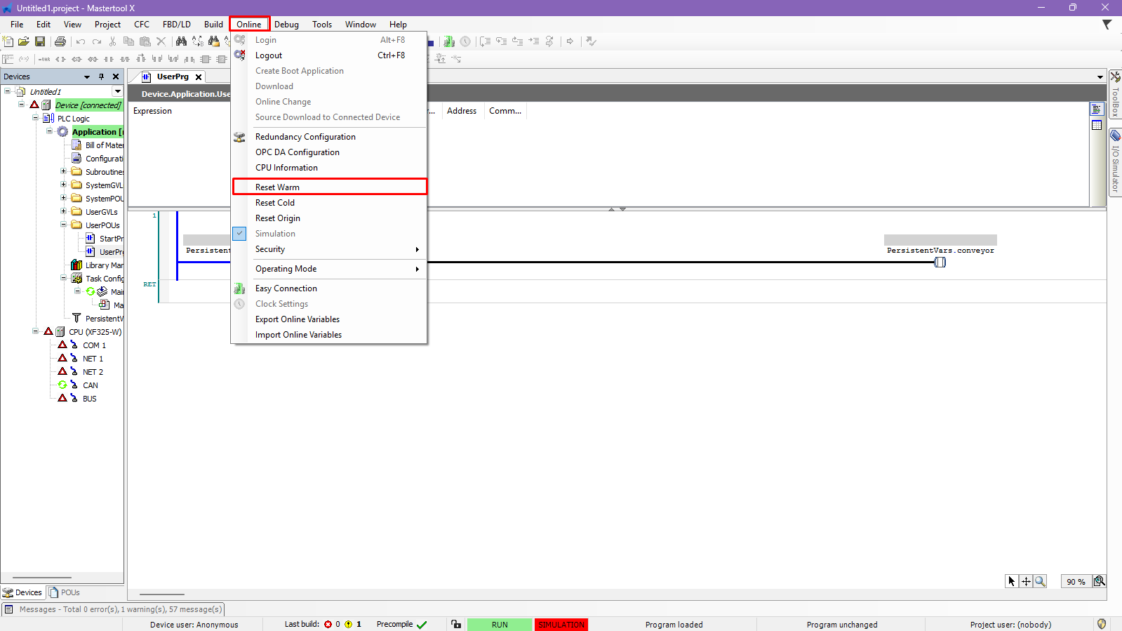 During the development, testing, or maintenance of an application, it may be necessary to reset the PLC. In MasterTool IEC XE, this can be done through the Online menu at the top, where three types of reset are available: Hot Reset, Cold Reset, and Source Reset.