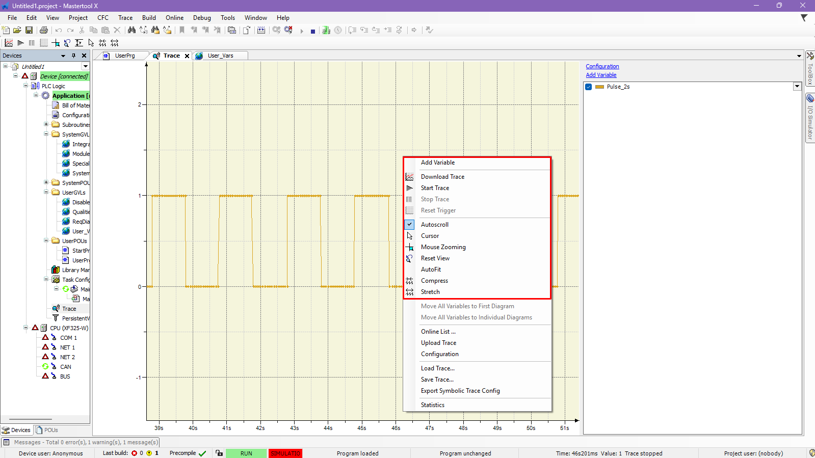 These options can be accessed by right-clicking on the Trace area, opening the context menu with the trace control functions.