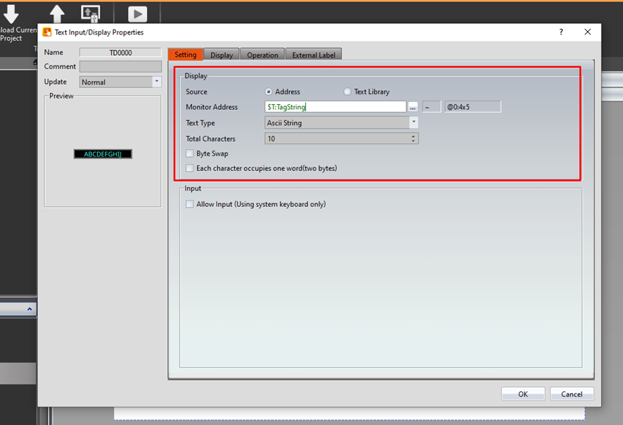 In the Text Type field, select the option ASCII String, so that the HMI correctly interprets the characters received via Modbus.