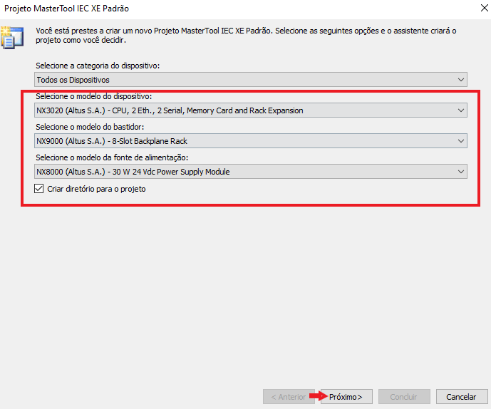For this simulation we will use the XP 340 and the NX 3020, since the NX3020 will be the Adapter we must open a program to configure it first, using it as hardware. So we will select the NX3020 and the programming language as LADDER; click next ensuring all languages are in ladder until "FINISH" appears and then the program will open.