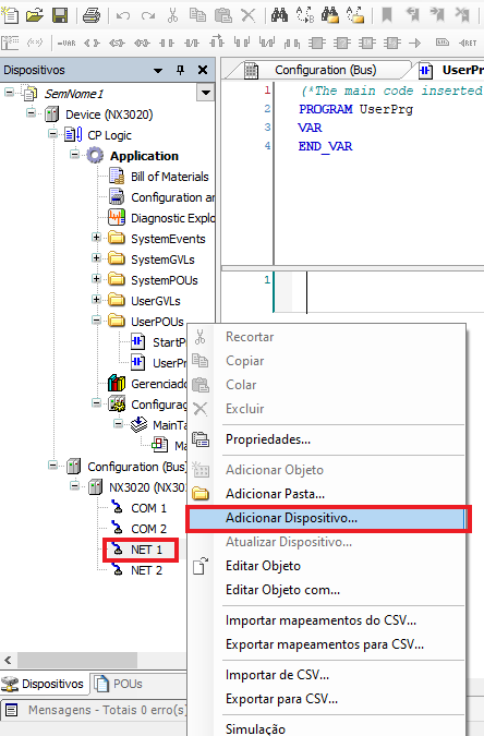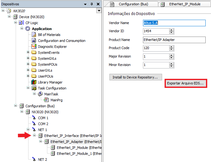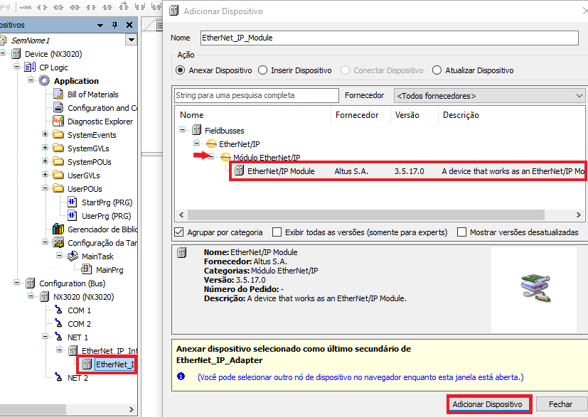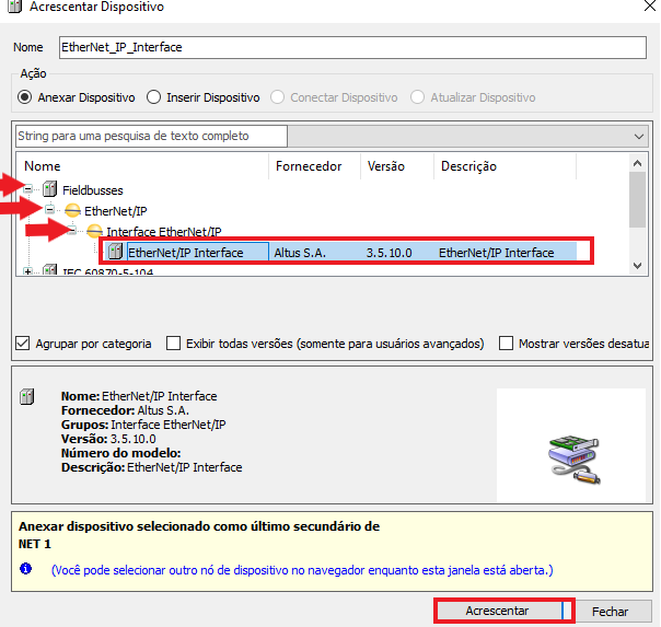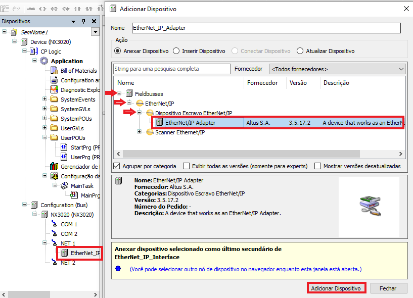 Right-click on NET1 and select the option "Add device" >> Fieldbusses click on Ethernet IP >> Ethernet IP Interface select and click "Add".