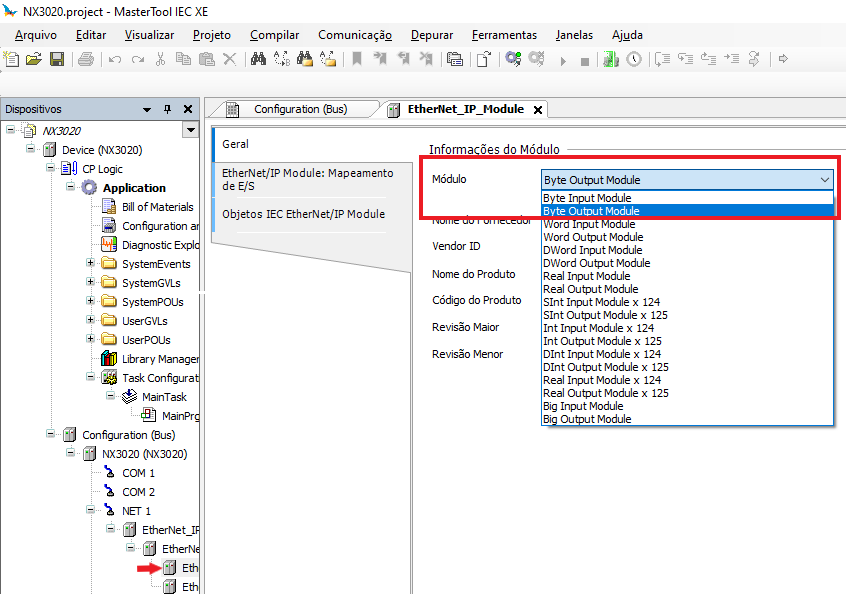 Double-click on one of the modules and the parameterization window will open. One of the modules will be configured as Byte Input module and the other as Byte Output Module.