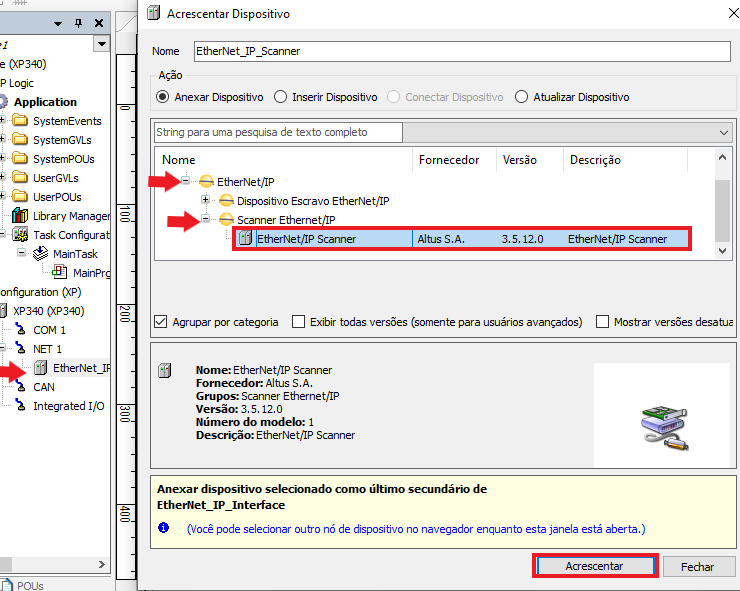 Select the Ethernet IP Scanner device, right-click>> add device and add the Ethernet IP Adapter device, click add and close