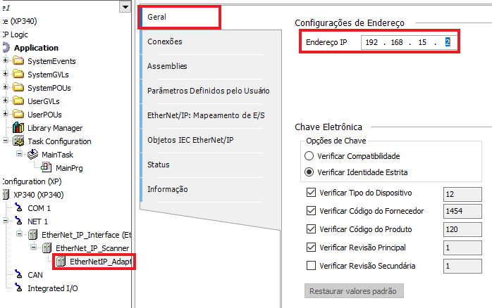 In the EthernetIP_Adapter tab click on general and enter the IP address of your PLC that will be the Adapter slave, that is, the address of the PLC that was loaded with the first program.