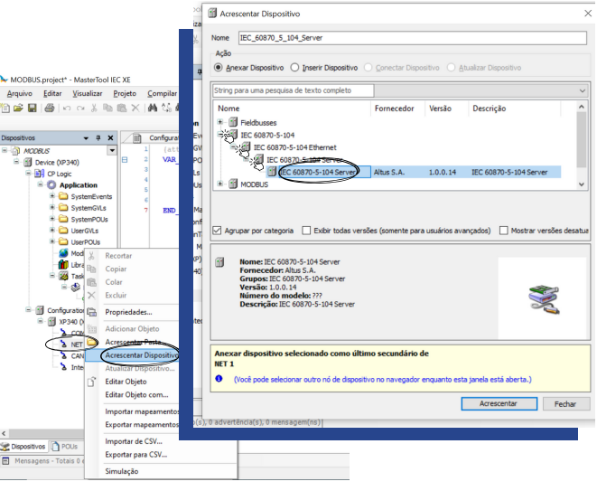 Right-click on the word NET1, then click Add Device. A window will appear, click the "+" symbol to the left of IEC60870-5-104, then do the same as shown beside; double-click IEC60870-5-104 Server and close the window.