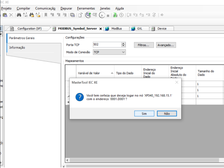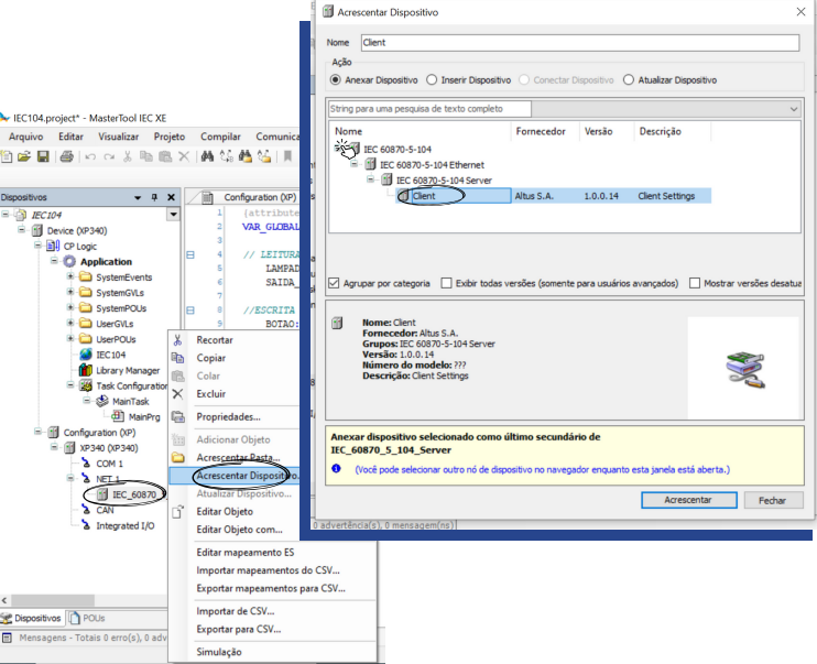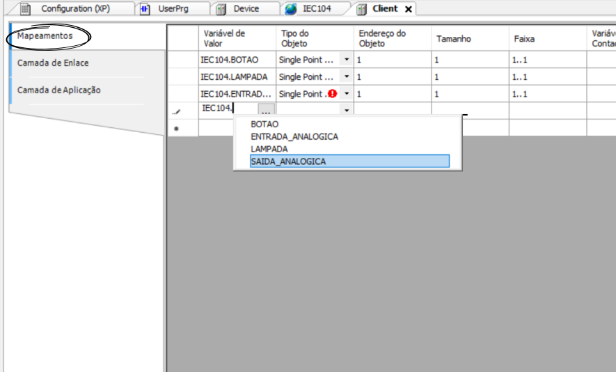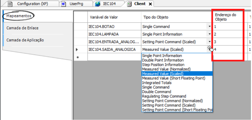 Close the device window; open the Client tab and declare the variables that were declared in the GVL. (in the example beside, the parameter for calling the GVL variables was not deleted, so it was necessary to show the GVL path) Next, it will be configured according to the IEC104 protocol