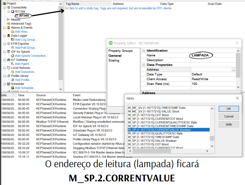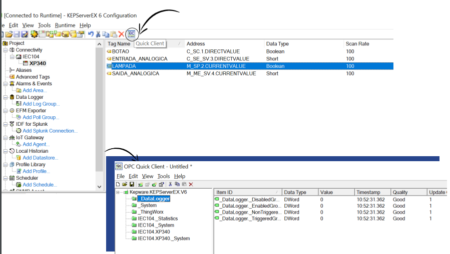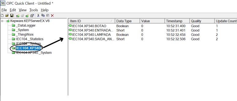 In the Quick Client window, select the option IEC104.device_name; in this option, the tags that were added will appear.