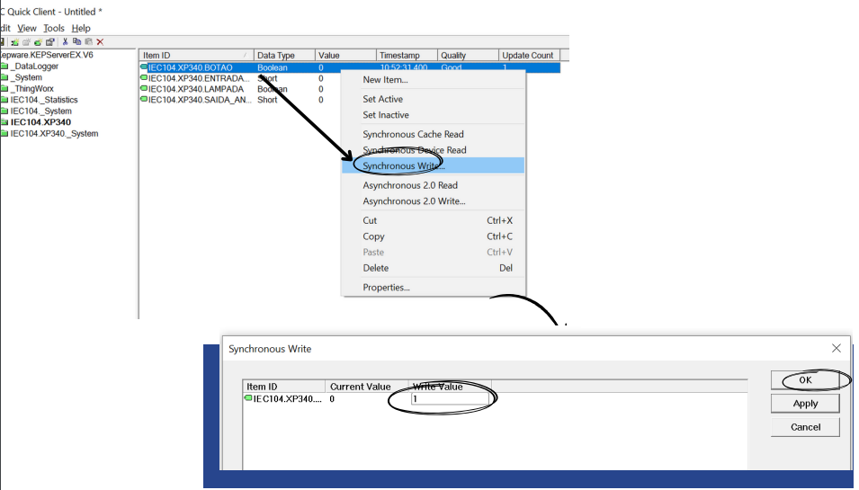 Select the Tag with the right mouse button, then click Synchronous Write. Enter the value you want to send to the tag and click OK. This process is the same for all tags.