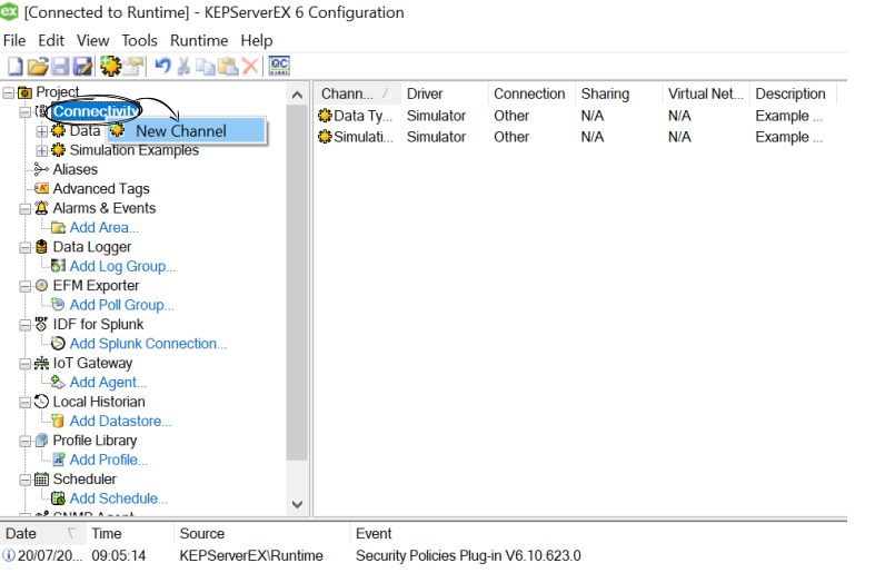 Open the Kepware simulator as administrator; then, in the project tree of the simulator, right-click on Connectivity and add a new channel in "New Channel"
