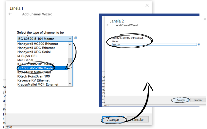 In the window that opens you will select the protocol. We will use 0 IEC 60870-5-104 Master, then click next; in the next window, name the channel if necessary and click next.