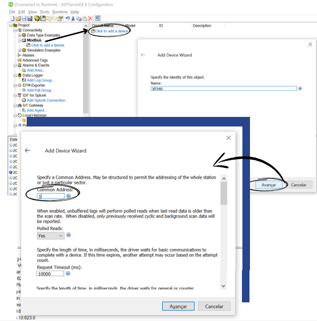Click on "Click to add device" to add a device within the created channel, if necessary you can name the device (in the example it was named as XP340). Then click Next 4 times until the field to enter the station address appears and click next until finish and return to the main screen
