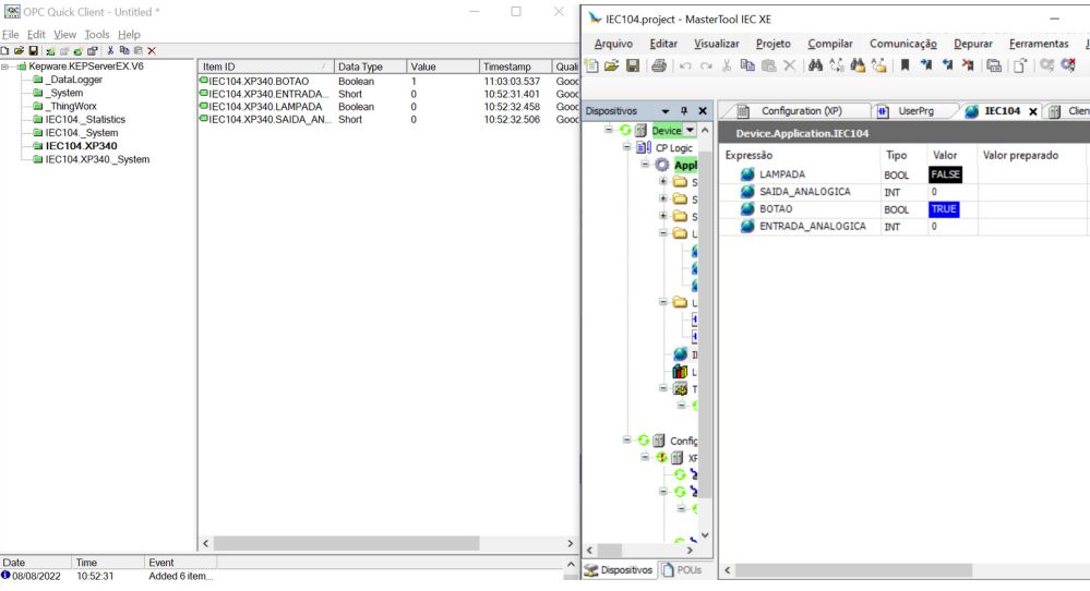 Split the screen between Quick Client and MasterTool to be able to view the change of state of the variables. On the second page of this document, you can access the link to the simulation video.