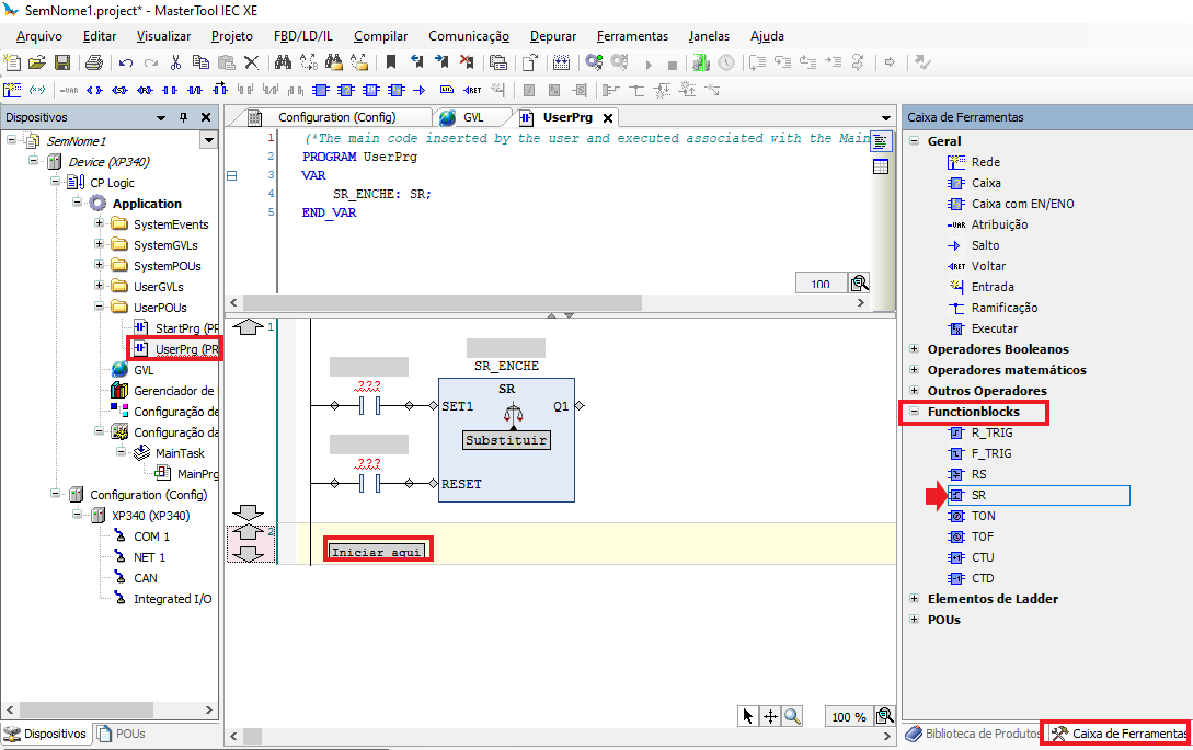 In UserPrg we will add some operators to make the logic more optimized. Select the toolbox, in Function blocks click and drag the SR block to the screen, drop the block on "start here" or on the arrow on the side.