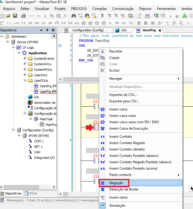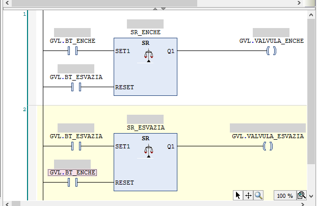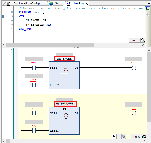 The Reset contact of the FILL block and the Set contact of the EMPTY block will be negated contacts. To do this, click once on the contact, when it turns red, right-click and then select negation.