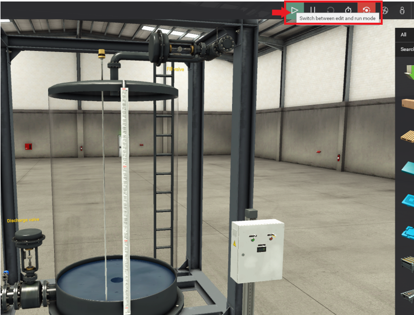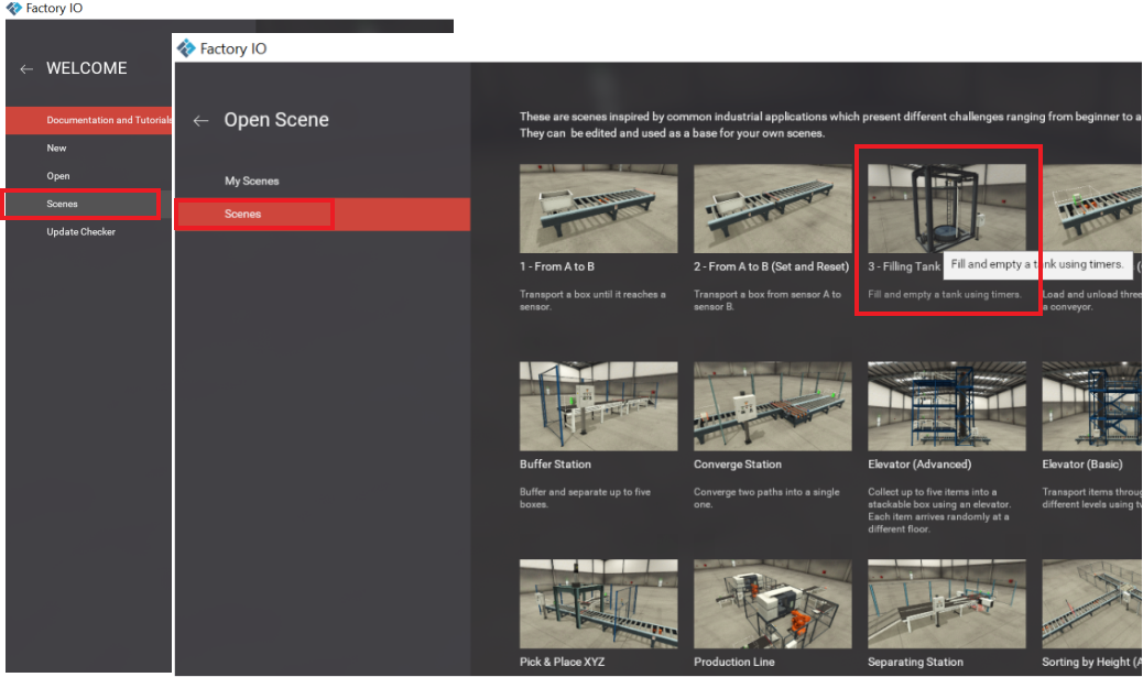 Open the FactoryIO software as administrator; In the main menu click on Scenes and another screen will appear with the predefined scenes, select the scene 3-Filling tank.