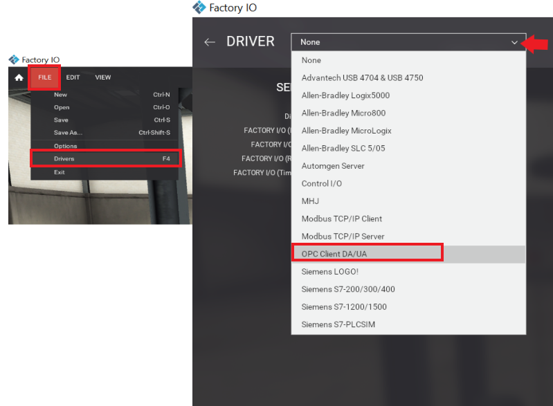 In the upper left corner of the scene screen click on Files >> Drivers. When it opens, click on the arrow on the right side of the search bar and select OPC Client DA/UA. Then click on configuration in the upper right corner of the screen where the driver was selected.
