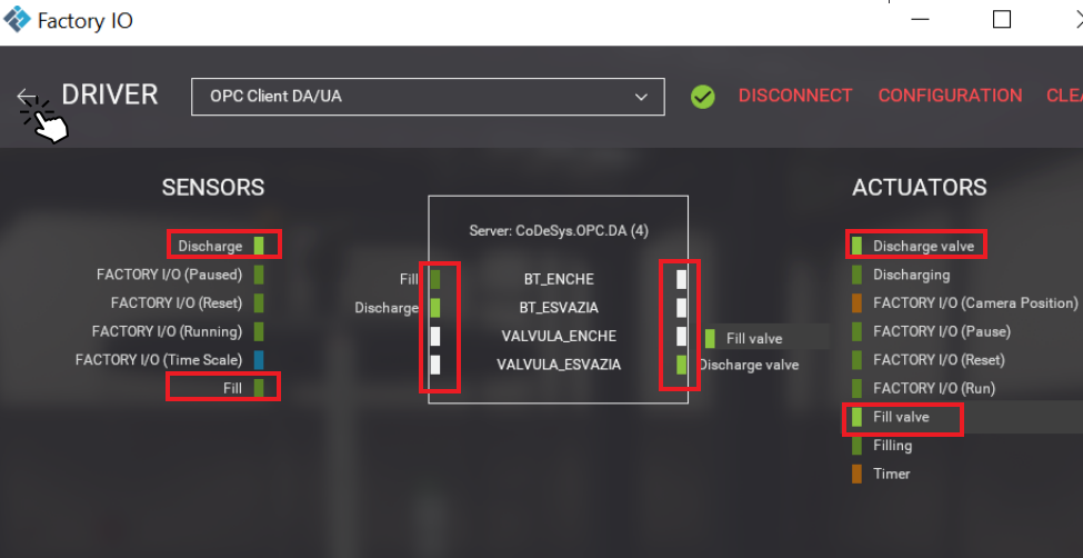 Then just link the variables to the tags that are predefined by the FactoryIO software, which are in English. Select the tag and drag it to the desired variable. Then click the arrow on the left side of the word DRIVER to return to the simulation screen.
