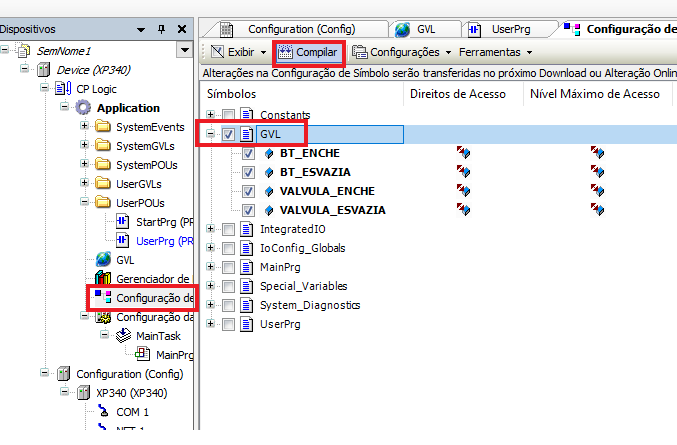 With the variables declared, add the Symbol Configuration object in the project tree. To do this, right-click on Application >> add object >> Symbol Configuration, a window will appear, click add. Then click compile for the GVL we added to appear, select it and click compile again.