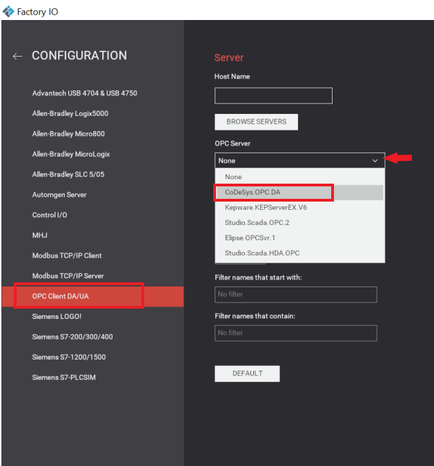 When the configuration window opens, click on OPC Server on the arrow to select the CoDeSysOPC/DA. Click on >> Browser below Items and Nodes. Then click on the >> configuration arrow to return to the drivers menu and the tag names will appear