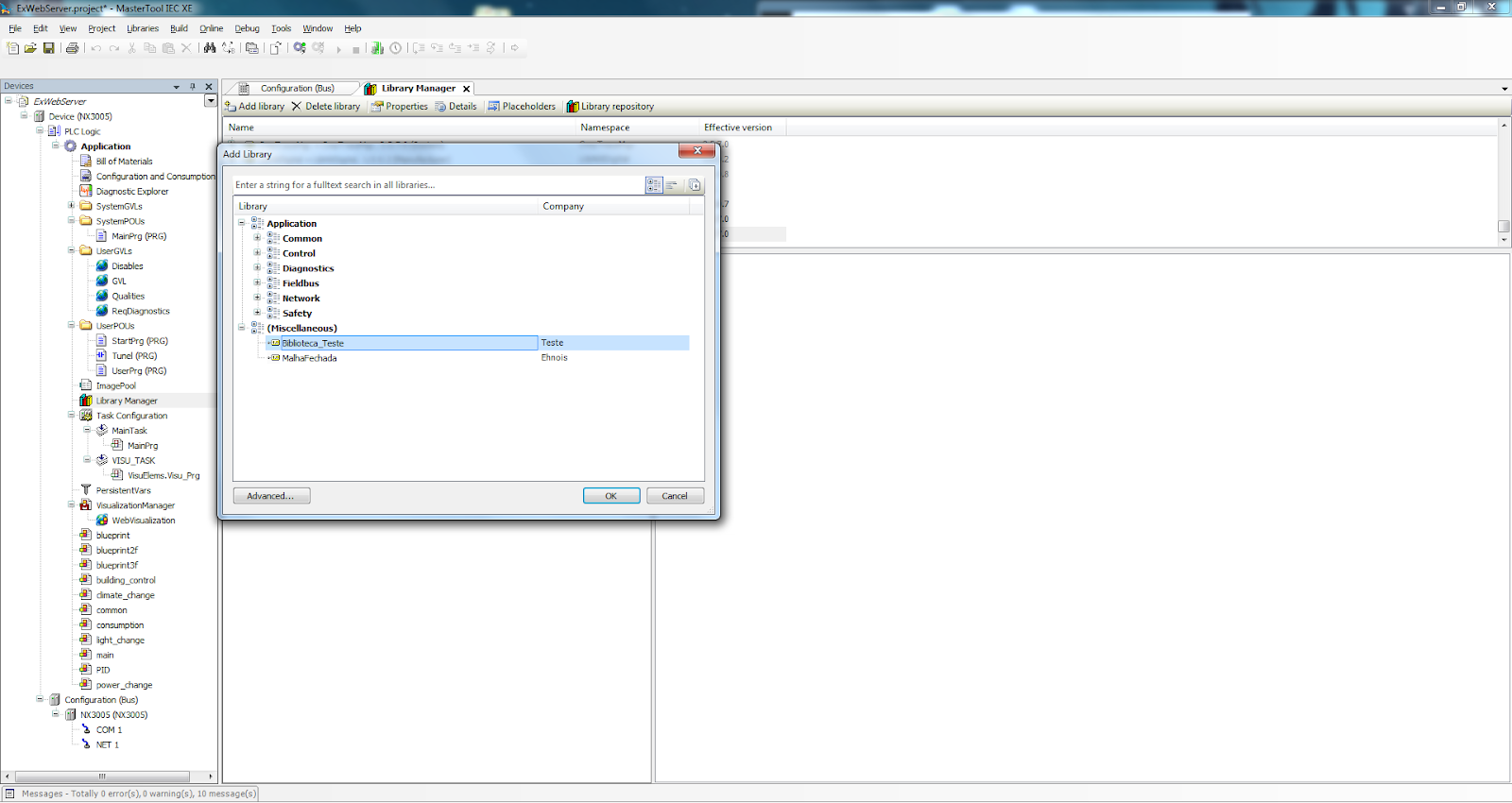 O MasterTool irá checar as POUs por erros. Quando terminar, a aba de Mensagens deverá apresentar 0 erros.